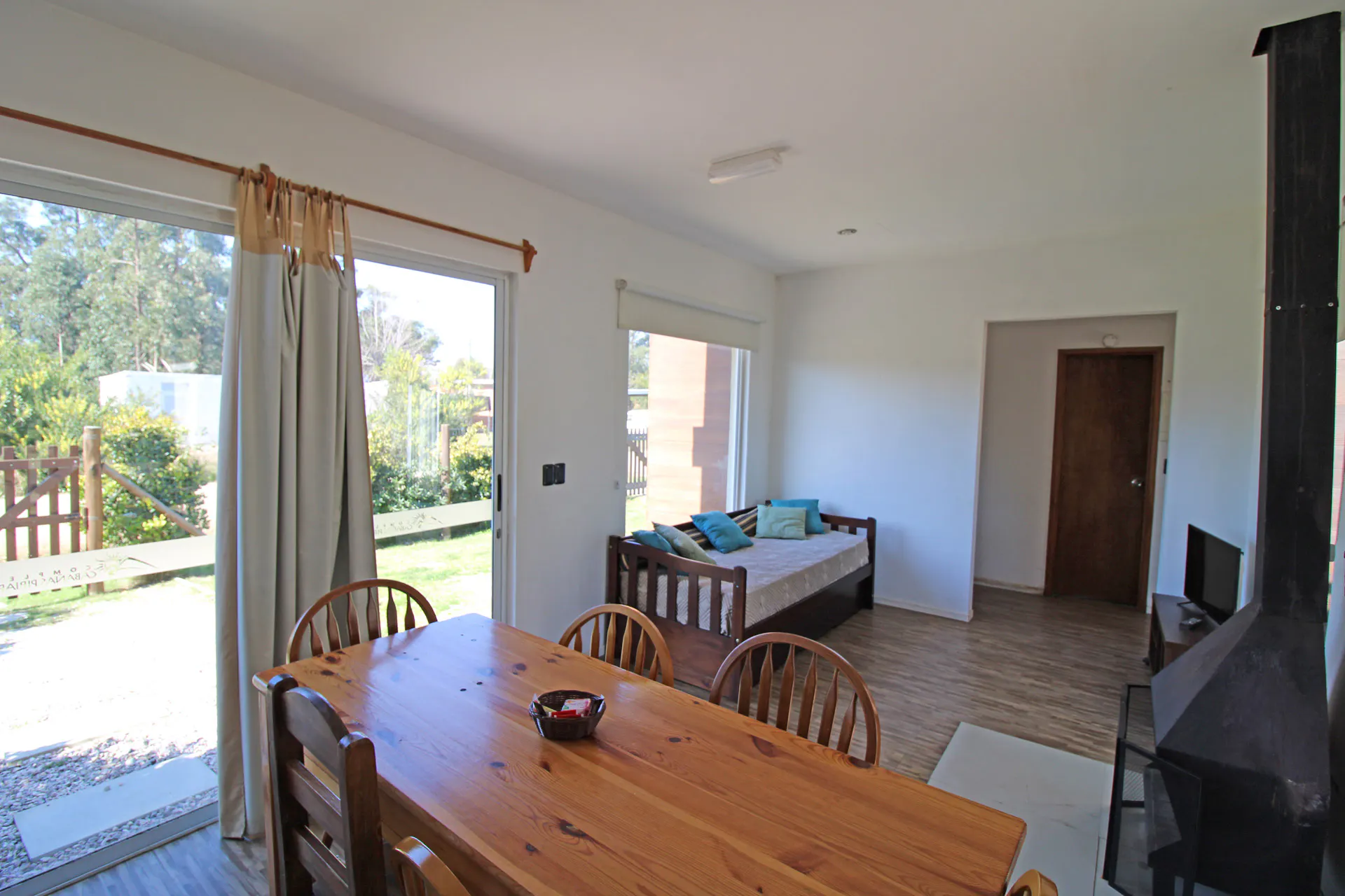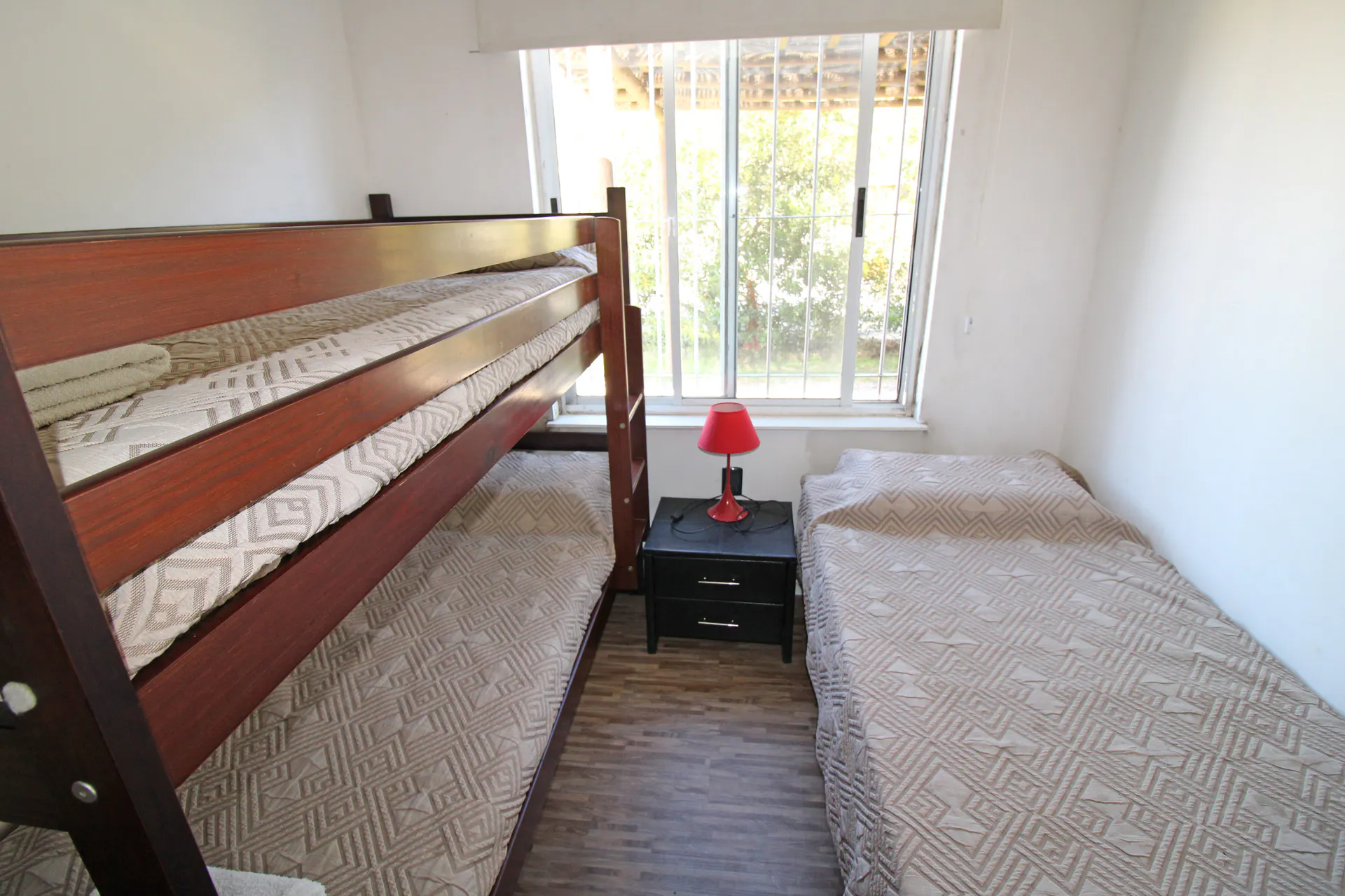 Camas: 1 cama de dos plazas en dormitorio matrimonial, 2 camas individuales en dormitorio twin y 1 cama marinera en el living-comedor.